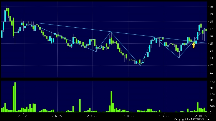 MOKINGRAN(02585.HK) appears an upside breakout, rose above the neckline. Last printed at 16.310; fell 4.059%; on volume of 127.20K shares and turnover of $2.14MRecent PerformanceIn...