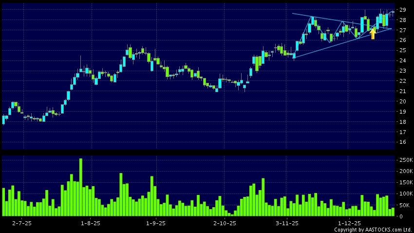 Triangle Breakout means the volatility of price movement is decreasing, stock price finally broke the top of triangle. An upward trend will start.(HK stocks quote is delayed for at least 15 mins.Short Selling Data as at 2025-12-31 12:25.)