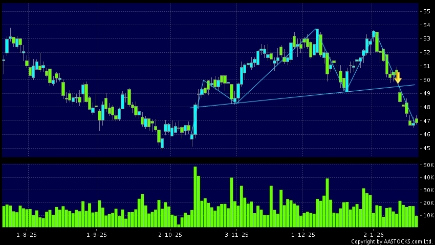 CM BANK(03968.HK) appears a downside breakout, dropped below the neckline. Last printed at 46.780; fell 0.085%; on volume of 10.17M shares and turnover of $478.34MRecent Performanc...