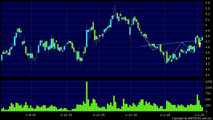 BOSIDENG(03998.HK) appears an upside breakout, rose above the neckline. Last printed at 4.780; rose 1.486%; on volume of 18.18M shares and turnover of $86.53MRecent PerformanceIn 3...