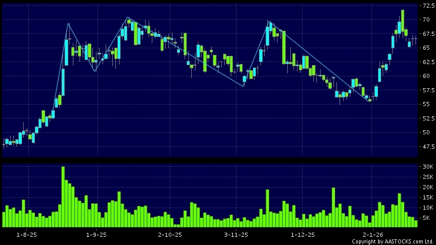 JD HEALTH(06618.HK) shows a triple top reversal. Last printed at 66.400; fell 0.300%; on volume of 3.92M shares and turnover of $260.49MRecent PerformanceIn 3 days: -1.190%In 5 day...