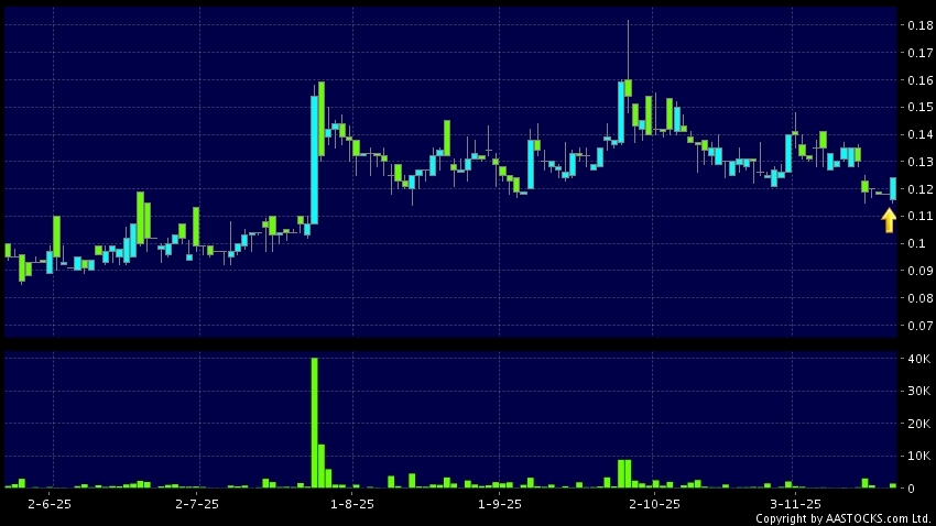 JOY SPREADER(06988.HK)  0.000 (0.000%)   shows a trend reversal. Last printed at 0.124; rose 5.085%; on volume of 1.39M shares and turnover of $161.90K