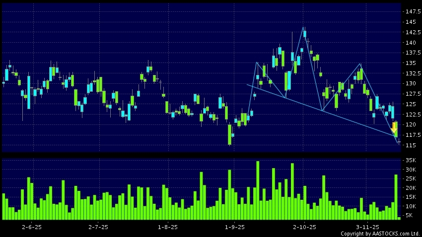 JD-SW(09618.HK) appears a downside breakout, dropped below the neckline. Last printed at 115.800; fell 0.941%; on volume of 4.18M shares and turnover of $483.93MRecent PerformanceI...