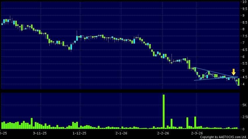 Triangle Breakout means the volatility of price movement is decreasing, stock price finally broke the bottom of triangle. A downward trend will start.(HK stocks quote is delayed for at least 15 mins.)
