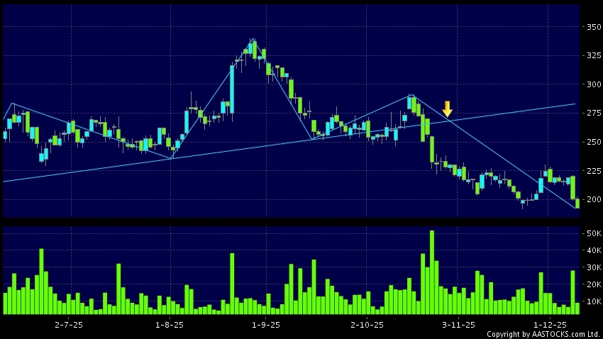 POP MART(09992.HK) appears a downside breakout, dropped below the neckline. Last printed at 192.300; fell 4.042%; on volume of 9.01M shares and turnover of $1.77BRecent Performance...