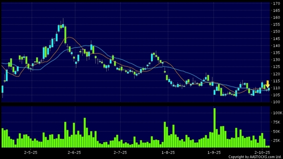 BYD COMPANY-100(01211.HK) -0.900 (-0.847%) Short selling $1.34B; Ratio 33.570% 's SMA 10 crosses below SMA 20, which is a death cross. Last printed at 109.900; rose 1.665%; on volume of 11.25M shares and turnover of $1.23BRecent PerformanceIn 3 days: -3.512%In 5 days: +1.197%In 10 days: +0.182%Recent transaction volume statistics:Volume of last trading day: 11.02M sharesAverage volume over the past 5 days: 28.71M sharesTechnical analysis explanation:Death cross is a bearish signal, which the short term SMA crosses below long term SMA, such as SMA 50 crosses below SMA 250. Investor should watch closely.(HK stocks quote is delayed for at least 15 mins.Short Selling Data as at 2025-10-14 16:25.)Related NewsView more stocks with downward technical trends >Disclaimer:The information, financial market data, quotes, charts, statistics and / or various technical analysis indicators are automatically generated based on the analyses and interpretations of publicly available information and should be used as references only at your own discretion. Such automatically generated content does not reflect the views or opinions of AASTOCKS.com Limited nor does AASTOCKS.com Limited make any guarantees to their accuracy, completeness, timeliness or correctness. You are advised to consult independent professional advice to verify pricing information or to obtain more detailed market information. Any uses of information or trades executed following the said automatically generated content are taken at your own risk for your own account.
