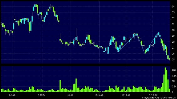 YANCOAL AUS(03668.HK) +0.020 (+0.078%) Short selling $17.92K; Ratio 0.265% shows a triple top reversal. Last printed at 24.980; fell 0.319%; on volume of 1.50M shares and turnover of $37.41MRecent PerformanceIn 3 days: -8.965%In 5 days: -8.565%In 10 days: -14.099%Recent transaction volume statistics:Volume of last trading day: 5.75M sharesAverage volume over the past 5 days: 7.86M sharesTechnical analysis explanation:Triple tops mean stock price rise three times to a similar level, but keep dropping afterward. The three tops is a critical resistant level.(HK stocks quote is delayed for at least 15 mins.Short Selling Data as at 2025-12-31 12:25.)Related NewsView more stocks with downward technical trends >Disclaimer:The information, financial market data, quotes, charts, statistics and / or various technical analysis indicators are automatically generated based on the analyses and interpretations of publicly available information and should be used as references only at your own discretion. Such automatically generated content does not reflect the views or opinions of AASTOCKS.com Limited nor does AASTOCKS.com Limited make any guarantees to their accuracy, completeness, timeliness or correctness. You are advised to consult independent professional advice to verify pricing information or to obtain more detailed market information. Any uses of information or trades executed following the said automatically generated content are taken at your own risk for your own account.