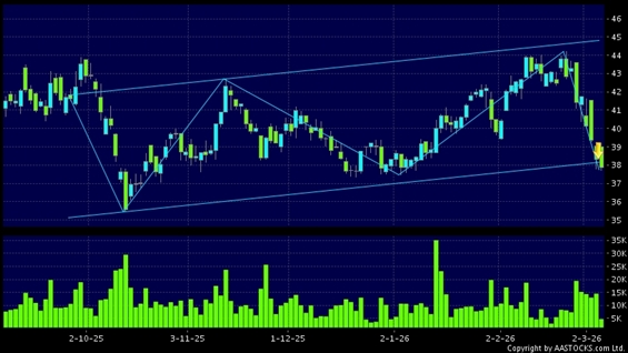 GALAXY ENT(00027.HK) +0.540 (+1.547%) Short selling $73.82M; Ratio 20.185% appears a downside range breakout. Last printed at 37.900; fell 1.044%; on volume of 4.78M shares and turnover of $183.84MRecent PerformanceIn 3 days: -5.533%In 5 days: -8.542%In 10 days: -12.024%Recent transaction volume statistics:Volume of last trading day: 14.48M sharesAverage volume over the past 5 days: 15.28M sharesTechnical analysis explanation:Range Breakout means stock price moved in a range recently, and it broke the bottom of the range finally. Investor should watch closely.(HK stocks quote is delayed for at least 15 mins.Short Selling Data as at 2026-03-27 16:25.)Related NewsView more stocks with downward technical trends >Disclaimer:The information, financial market data, quotes, charts, statistics and / or various technical analysis indicators are automatically generated based on the analyses and interpretations of publicly available information and should be used as references only at your own discretion. Such automatically generated content does not reflect the views or opinions of AASTOCKS.com Limited nor does AASTOCKS.com Limited make any guarantees to their accuracy, completeness, timeliness or correctness. You are advised to consult independent professional advice to verify pricing information or to obtain more detailed market information. Any uses of information or trades executed following the said automatically generated content are taken at your own risk for your own account.