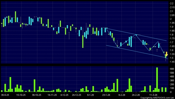 FIN STREET SEC(01476.HK) -0.050 (-3.205%) appears a downside range breakout. Last printed at 1.490; fell 0.667%; on volume of 0.00 shares and turnover of $0.00Recent PerformanceIn 3 days: -6.875%In 5 days: -11.834%In 10 days: -6.875%Recent transaction volume statistics:Volume of last trading day: 116.00K sharesAverage volume over the past 5 days: 64.60K sharesTechnical analysis explanation:Range Breakout means stock price moved in a range recently, and it broke the bottom of the range finally. Investor should watch closely.(HK stocks quote is delayed for at least 15 mins.)Related NewsView more stocks with downward technical trends >Disclaimer:The information, financial market data, quotes, charts, statistics and / or various technical analysis indicators are automatically generated based on the analyses and interpretations of publicly available information and should be used as references only at your own discretion. Such automatically generated content does not reflect the views or opinions of AASTOCKS.com Limited nor does AASTOCKS.com Limited make any guarantees to their accuracy, completeness, timeliness or correctness. You are advised to consult independent professional advice to verify pricing information or to obtain more detailed market information. Any uses of information or trades executed following the said automatically generated content are taken at your own risk for your own account.