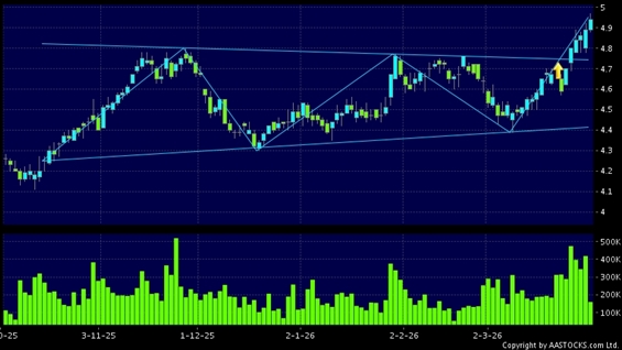 BANK OF CHINA(03988.HK) +0.050 (+0.998%) Short selling $358.68M; Ratio 92.286% shows a triangle breakout. Last printed at 4.940; rose 1.022%; on volume of 164.82M shares and turnover of $812.61MRecent PerformanceIn 3 days: +2.066%In 5 days: +5.106%In 10 days: +6.237%Recent transaction volume statistics:Volume of last trading day: 418.32M sharesAverage volume over the past 5 days: 384.65M sharesTechnical analysis explanation:Triangle Breakout means the volatility of price movement is decreasing, stock price finally broke the top of triangle. An upward trend will start.(HK stocks quote is delayed for at least 15 mins.Short Selling Data as at 2026-04-02 16:25.)Related NewsView more stocks with upward technical trends >Disclaimer:The information, financial market data, quotes, charts, statistics and / or various technical analysis indicators are automatically generated based on the analyses and interpretations of publicly available information and should be used as references only at your own discretion. Such automatically generated content does not reflect the views or opinions of AASTOCKS.com Limited nor does AASTOCKS.com Limited make any guarantees to their accuracy, completeness, timeliness or correctness. You are advised to consult independent professional advice to verify pricing information or to obtain more detailed market information. Any uses of information or trades executed following the said automatically generated content are taken at your own risk for your own account.