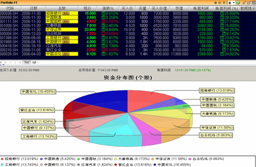 提供多组投资组合的帐面利润、买入价值、市场价值,并按行业、个股显示每项投资组合的投资比例,图形化的表现方式让你的投资组合一目了然。