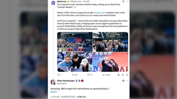 百度-SW(09888.HK)发布了全球首款手机龙虾应用——「红手指Operator」,用户下载App其即可实现手机「养虾」。上线后,迅速引爆下载热潮,系统后台资源出现紧缺提示。百度智能云回应称,正全速调配资源扩容,全力保障用户体验。 OpenClaw创始人Peter Steinberger今天(12日)在海外社交平台上连发两条回覆,称中国AI创新速度「Amazing」,并表示愿与百度共同开发龙虾。 此前,百度已推出Duclaw,支持用户在电脑端零门槛「养虾」。(hc/da)AASTOCKS新闻 |
