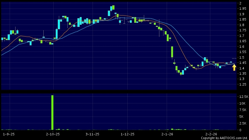 龙记集团(00255.HK) +0.010 (+0.709%) 10天移动平均线升穿20天移动平均线,出现黄金交叉。现价报1.490,无升跌,成交量0.00股,成交额0.00。