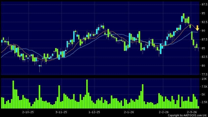 死亡交叉是一个利淡信号,指股价的短期移动平均线跌穿长期移动平均线,例如50天线跌穿250天线,在图表上构成交叉的形状。股价通常会下跌形成一个下降趋势,技术走势偏软。(港股报价延迟最少十五分钟。沽空资料截至 2026-03-06 16:25。)
