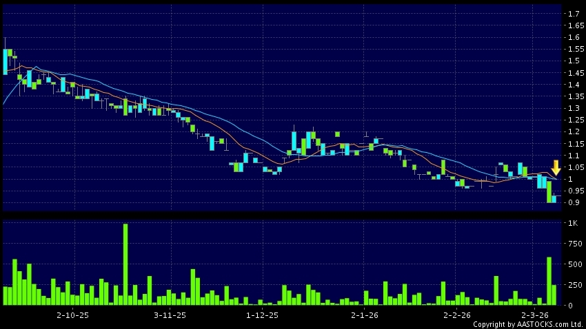 思捷环球(00330.HK) -0.010 (-1.111%) 10天移动平均线跌穿20天移动平均线,出现死亡交叉。现价报0.930,无升跌,成交量300.00股,成交额255.00。