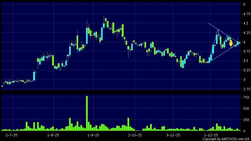 三角形向下突破是指股价的波幅渐渐收窄,在图表上形成三角形般的状态。股价在三角形的末端向下突破,下跌趋势形成,技术走势偏软。(港股报价延迟最少十五分钟。沽空资料截至 2026-01-09 16:25。)
