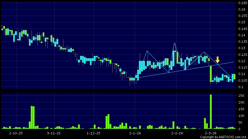 众安集团(00672.HK) +0.003 (+3.409%) 呈现头肩顶向下突破。现价报0.106,下跌3.636%,成交量86.14万股,成交额9.10万。
