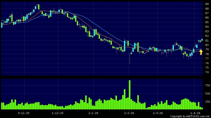 黄金交叉是一个利好讯号,指股价的短期移动平均线升穿长期移动平均线,例如50天线升穿250天线,在图表上构成交叉的形状。股价通常会上升形成一个上升趋势,技术走势向好。(港股报价延迟最少十五分钟。沽空资料截至 2026-04-13 16:25。)