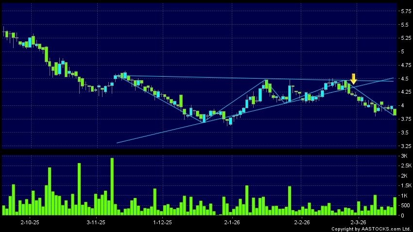 三角形向下突破是指股价的波幅渐渐收窄,在图表上形成三角形般的状态。股价在三角形的末端向下突破,下跌趋势形成,技术走势偏软。(港股报价延迟最少十五分钟。)