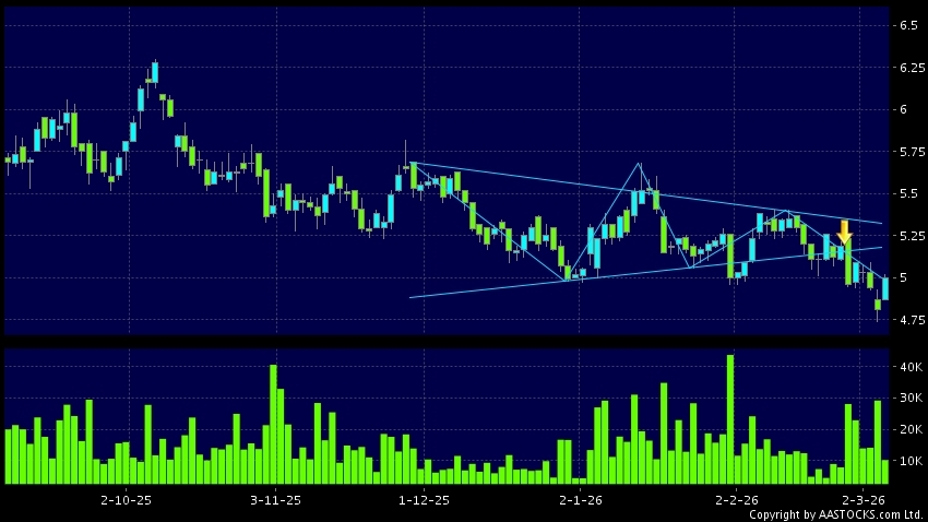 三角形向下突破是指股价的波幅渐渐收窄,在图表上形成三角形般的状态。股价在三角形的末端向下突破,下跌趋势形成,技术走势偏软。(港股报价延迟最少十五分钟。沽空资料截至 2026-03-20 16:25。)