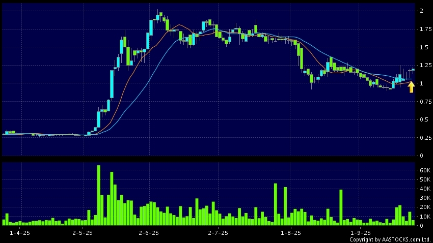 中国碳中和(01372.HK) -0.030 (-2.752%) 10天移动平均线升穿20天移动平均线,出现黄金交叉。现价报1.190,上升0.847%,成交量5.93百万股,成交额7.04百万。