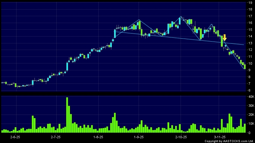 头肩顶是典型的沽出讯号,当股价跌穿支持线(颈线)时,跌势确认股价将持续下跌,技术走势偏软。(港股报价延迟最少十五分钟。沽空资料截至 2025-11-25 16:25。)