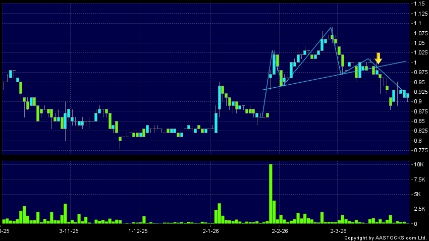 头肩顶是典型的沽出讯号,当股价跌穿支持线(颈线)时,跌势确认股价将持续下跌,技术走势偏软。(港股报价延迟最少十五分钟。)