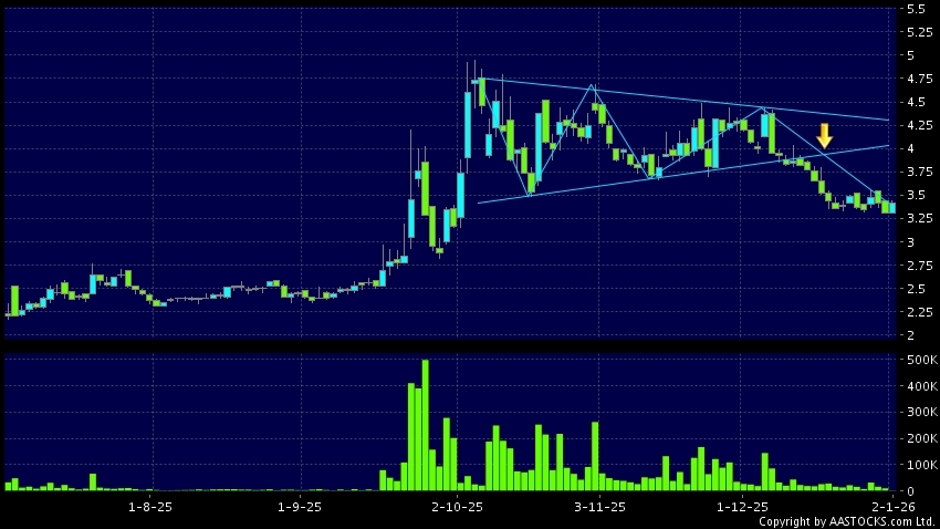 三角形向下突破是指股价的波幅渐渐收窄,在图表上形成三角形般的状态。股价在三角形的末端向下突破,下跌趋势形成,技术走势偏软。(港股报价延迟最少十五分钟。沽空资料截至 2026-01-09 16:25。)