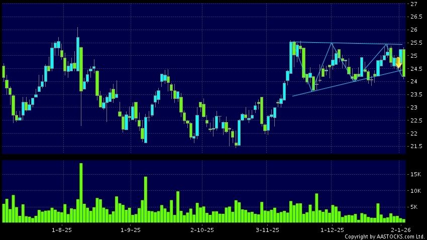 三角形向下突破是指股价的波幅渐渐收窄,在图表上形成三角形般的状态。股价在三角形的末端向下突破,下跌趋势形成,技术走势偏软。(港股报价延迟最少十五分钟。沽空资料截至 2026-01-08 16:25。)