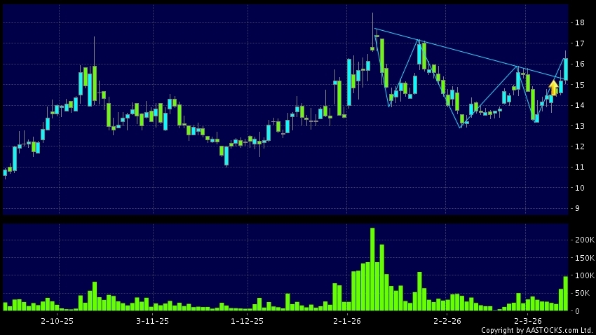 头肩底是典型的利好讯号,当股价升穿阻力线时,升势确认股价将持续上升,技术走势向好。(港股报价延迟最少十五分钟。沽空资料截至 2026-03-12 16:25。)