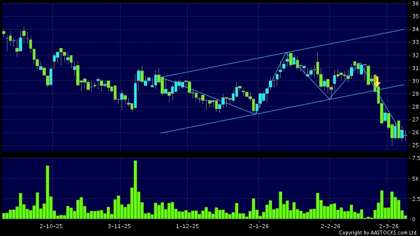 区域突破指股价在过去的一段时间只在一个范围在内活动,然後股价下跌作出突破,跌穿区域的底部,技术走势偏软。(港股报价延迟最少十五分钟。沽空资料截至 2026-03-17 16:25。)