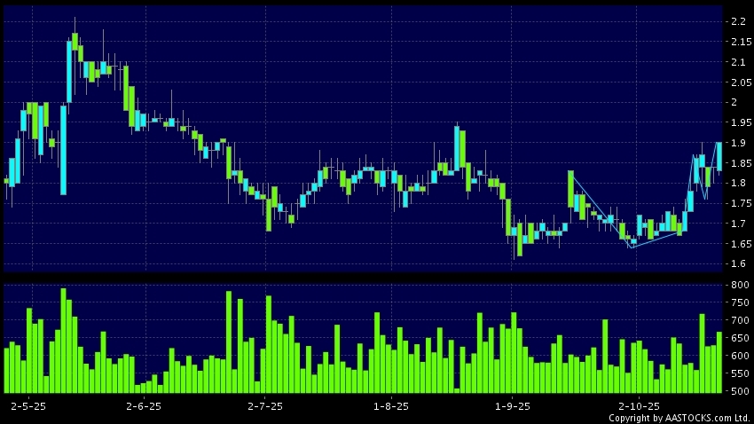 众诚能源(02337.HK) -0.020 (-1.053%) 呈现杯柄形向上突破。现价报1.900,上升3.261%,成交量66.70万股,成交额1.23百万。
