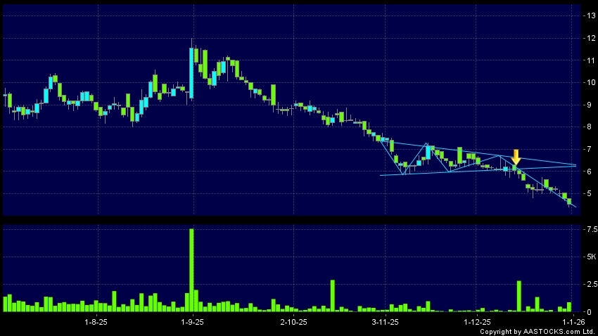 三角形向下突破是指股价的波幅渐渐收窄,在图表上形成三角形般的状态。股价在三角形的末端向下突破,下跌趋势形成,技术走势偏软。(港股报价延迟最少十五分钟。沽空资料截至 2026-01-07 12:25。)