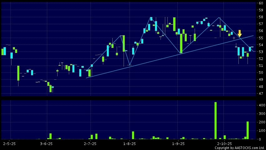 头肩顶是典型的沽出讯号,当股价跌穿支持线(颈线)时,跌势确认股价将持续下跌,技术走势偏软。(港股报价延迟最少十五分钟。沽空资料截至 2025-10-23 16:25。)