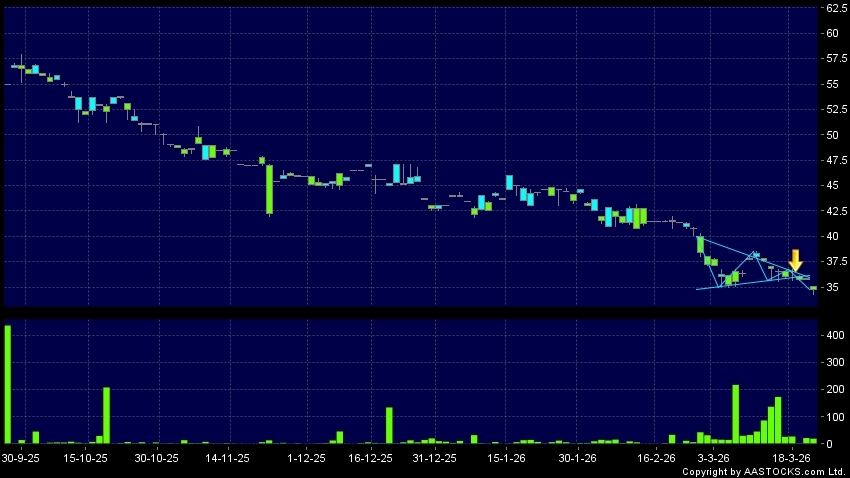三角形向下突破是指股价的波幅渐渐收窄,在图表上形成三角形般的状态。股价在三角形的末端向下突破,下跌趋势形成,技术走势偏软。(港股报价延迟最少十五分钟。沽空资料截至 2026-03-23 16:25。)
