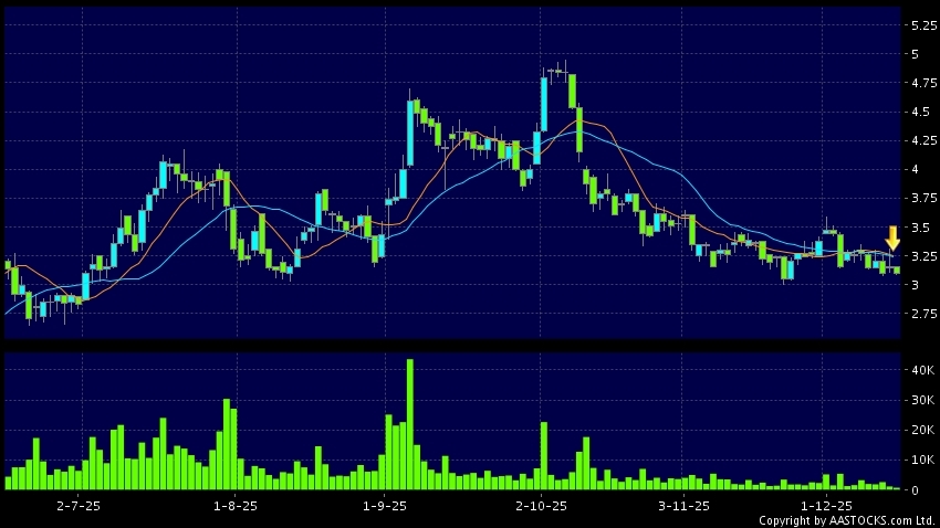 华领医药-B(02552.HK) +0.010 (+0.326%) 沽空 $12.10万; 比率 3.848% 10天移动平均线跌穿20天移动平均线,出现死亡交叉。现价报3.090,下跌2.215%,成交量90.30万股,成交额2.80百万。