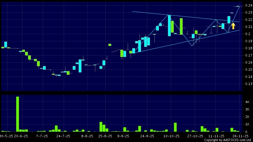三角形向上突破是指股价的波幅渐渐收窄,在图表上形成三角形般的状态。股价在三角形的末端向上突破,形成上升趋势,技术走势向好。(港股报价延迟最少十五分钟。)