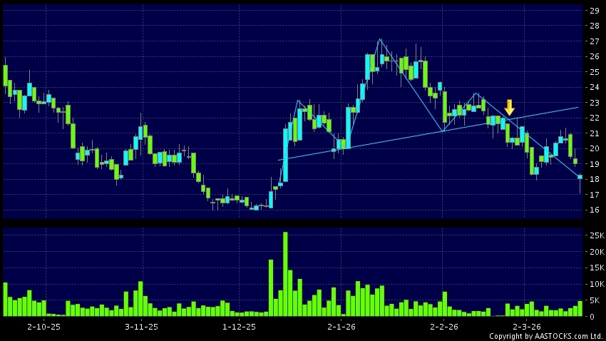 头肩顶是典型的沽出讯号,当股价跌穿支持线(颈线)时,跌势确认股价将持续下跌,技术走势偏软。(港股报价延迟最少十五分钟。沽空资料截至 2026-03-31 16:25。)