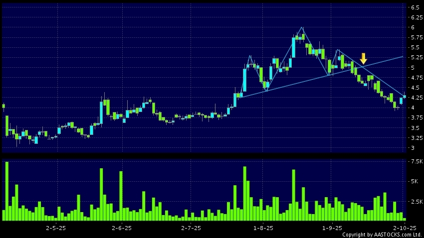 头肩顶是典型的沽出讯号,当股价跌穿支持线(颈线)时,跌势确认股价将持续下跌,技术走势偏软。(港股报价延迟最少十五分钟。沽空资料截至 2025-10-15 16:25。)