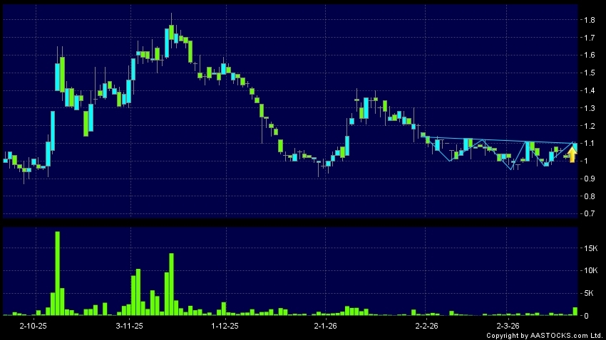 金马能源(06885.HK) +0.020 (+1.905%) 呈現頭肩底向上突破,股價升穿頸線。现价报1.100,上升4.762%,成交量1.86百万股,成交额1.97百万。