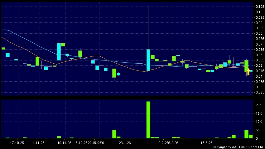 陆庆娱乐(08052.HK) 0.000 (0.000%) 10天移动平均线升穿20天移动平均线,出现黄金交叉。现价报0.046,上升4.545%,成交量2.20百万股,成交额10.39万。