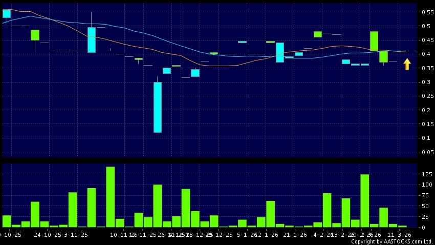 TRUE PARTNER(08657.HK) 0.000 (0.000%) 10天移动平均线升穿20天移动平均线,出现黄金交叉。现价报0.410,无升跌,成交量0.00股,成交额0.00。