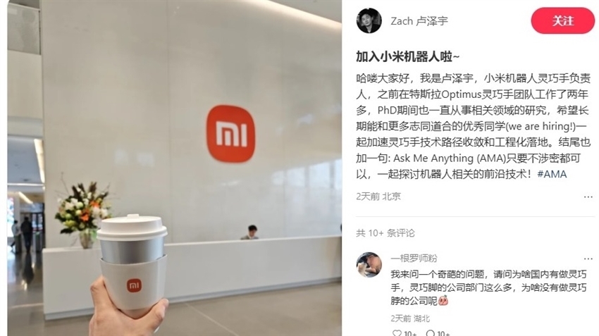 Tesla(TSLA.US) Optimus灵巧手团队前成员卢泽宇已加入小米(01810.HK) -0.240 (-0.595%) 沽空 $15.84亿; 比率 19.541% 机械人团队,负责灵巧手。
