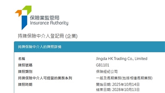 保險業監管局持牌保險中介人登記冊顯示,京東-SW(09618.HK)(JD.US)旗下Jingda HK Trading Co., Limited本月14日已取得保險經紀公司牌照,可從事一般及長期業務,包括相連長期業務,負責人為林志全,牌照有效期至2028年10月止。