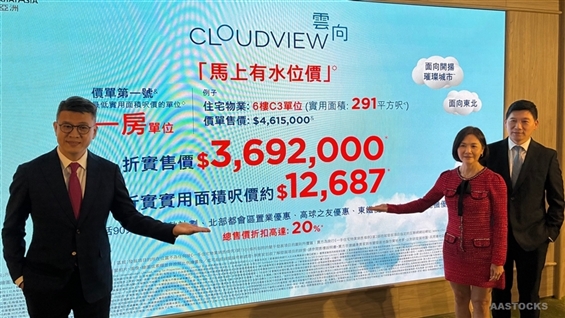 永泰地產(00369.HK)粉嶺粉錦公路663號「CLOUDVIEW 雲向」公布首張價單,涉及154伙,包括3伙開放式、124伙一房戶及27伙兩房戶,面積介乎286呎至445呎,折實平均呎價13,974元,價單折實總價6.8億元。 一房入場單位為6樓C3單位,面向東北城市景觀,面積291平方呎,折實售價369.2萬,實呎12,687元。兩房入場單位為6樓B6單位,面向西南高爾夫球場景,面積403平方呎,折實價635.1萬,實呎15,759元。 永泰地產執行董事兼銷售及市務總監楊聰永形容是次開價為「馬上有水位」,首批單位售價低於成本價,亦不設大手優惠,冀更多買家可享北都發展引擎機遇,之後有機會加價。他表示明天(4日)將開放示範單位,預期下周公布銷售安排,下周末開始銷售。(ss/da)AASTOCKS新聞 |