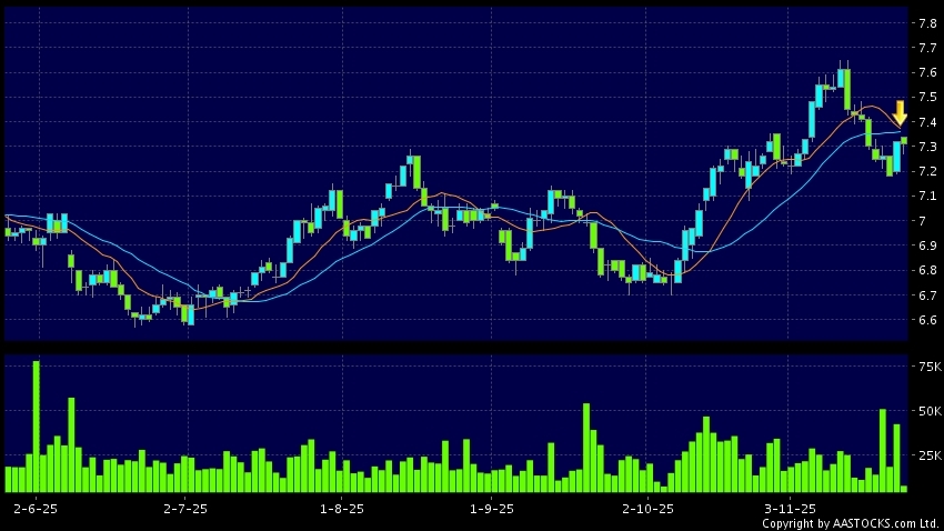 香港中華煤氣(00003.HK) +0.040 (+0.549%) 沽空 $3.24千萬; 比率 36.816% 10天移動平均線跌穿20天移動平均線,出現死亡交叉。現價報7.300,下跌0.273%,成交量7.66百萬股,成交額5.60千萬。