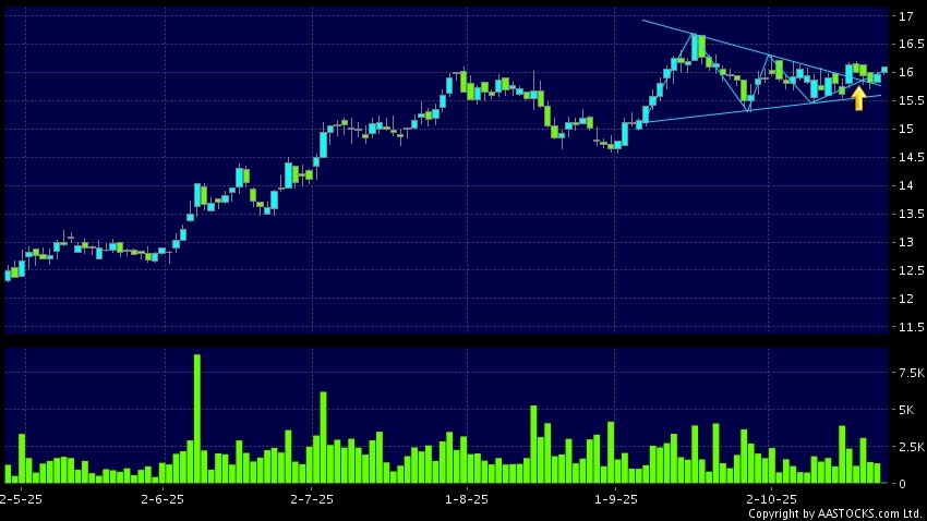 三角形向上突破是指股價的波幅漸漸收窄,在圖表上形成三角形般的狀態。股價在三角形的末端向上突破,形成上升趨勢,技術走勢向好。(港股報價延遲最少十五分鐘。沽空資料截至 2025-10-27 16:25。)