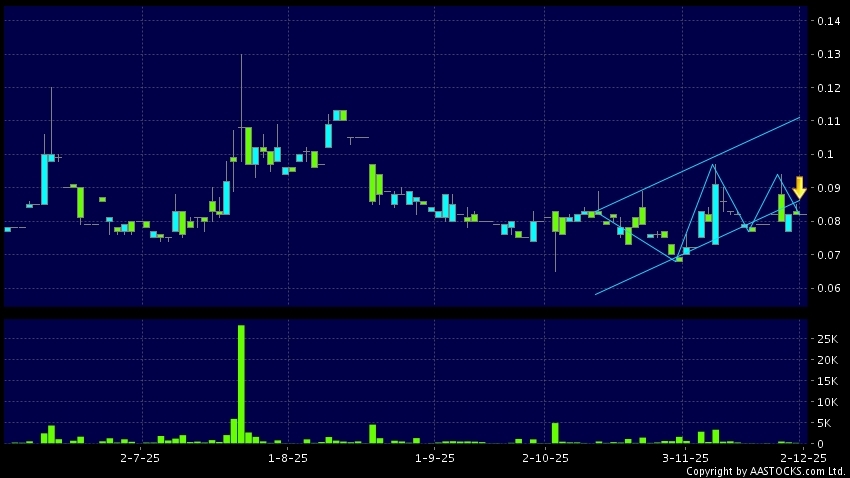 綠領控股(00061.HK) +0.005 (+6.329%) 呈現區域下軌突破。現價報0.082,無升跌,成交量0.00股,成交額0.00。