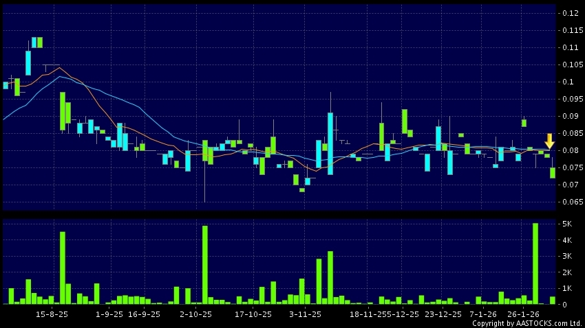 綠領控股(00061.HK) +0.001 (+1.282%) 10天移動平均線跌穿20天移動平均線,出現死亡交叉。現價報0.071,下跌8.974%,成交量70.00萬股,成交額5.17萬。