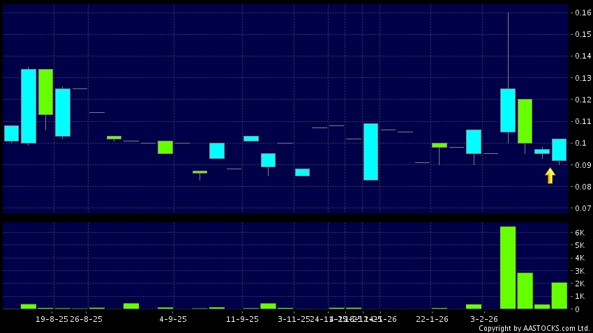 世紀建業(00079.HK) -0.001 (-0.962%) 的股價出現趨勢逆轉。現價報0.102,上升5.155%,成交量2.07百萬股,成交額18.72萬。